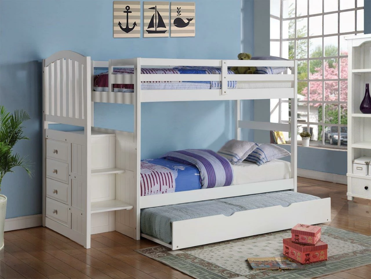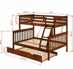 The twin over twin Mission stairway bunk bed adds a warm look to any bedroom with the Mission headboard panels, and warm white finish. The 4-drawer chest is a perfect space saver in any room and can be assembled on either end. The twin roll out trundle is perfect for overnight guests.