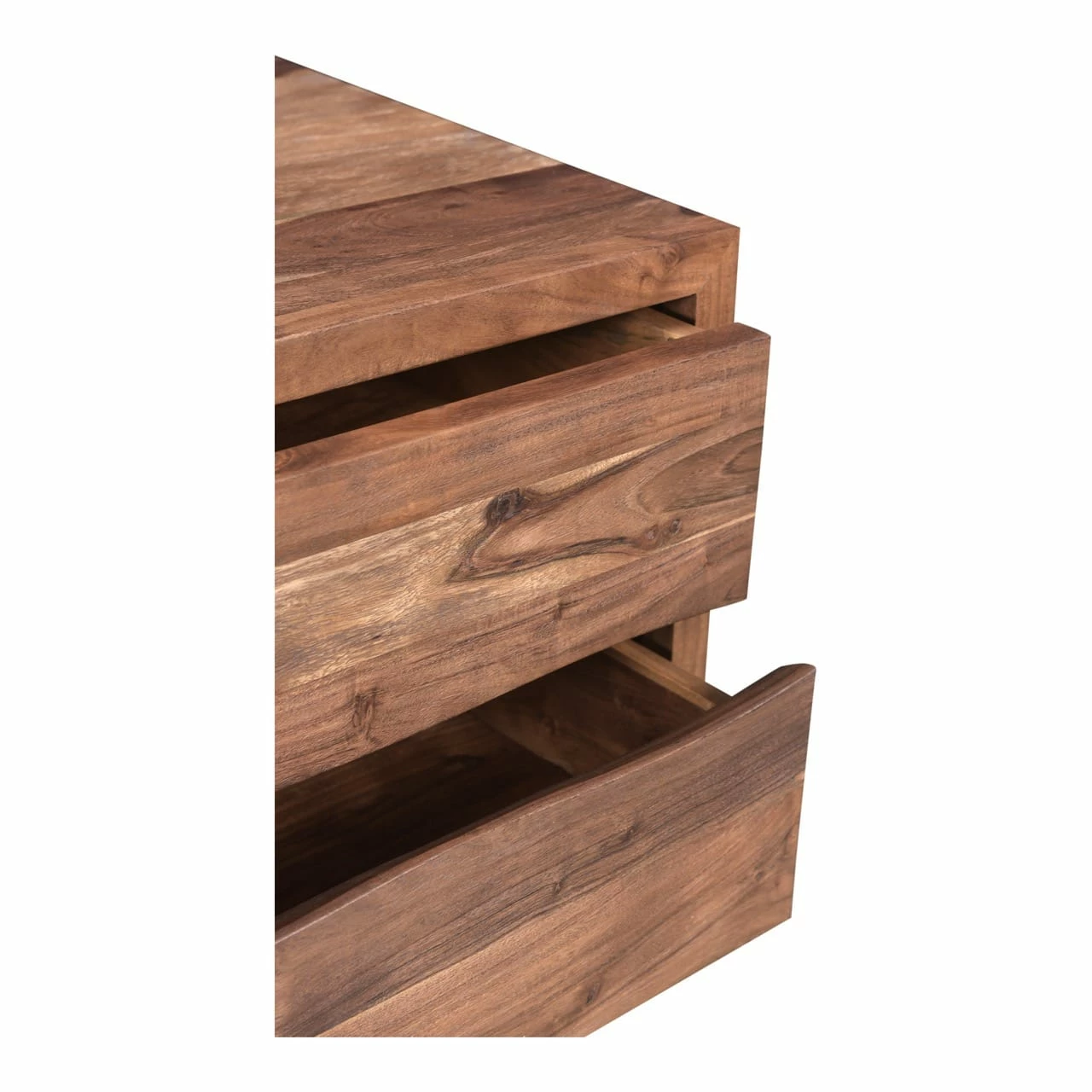The Bent collection puts nature’s craft front and center. Made of beautiful solid acacia wood, rustic live edge detailing shows off the unique knots and whorls of the wood. This nightstand features 2 drawers on easy slide glides, offering a convenient storage solution for your bedroom space. Pair with other pieces in the Bent bedroom collection for a complete look.