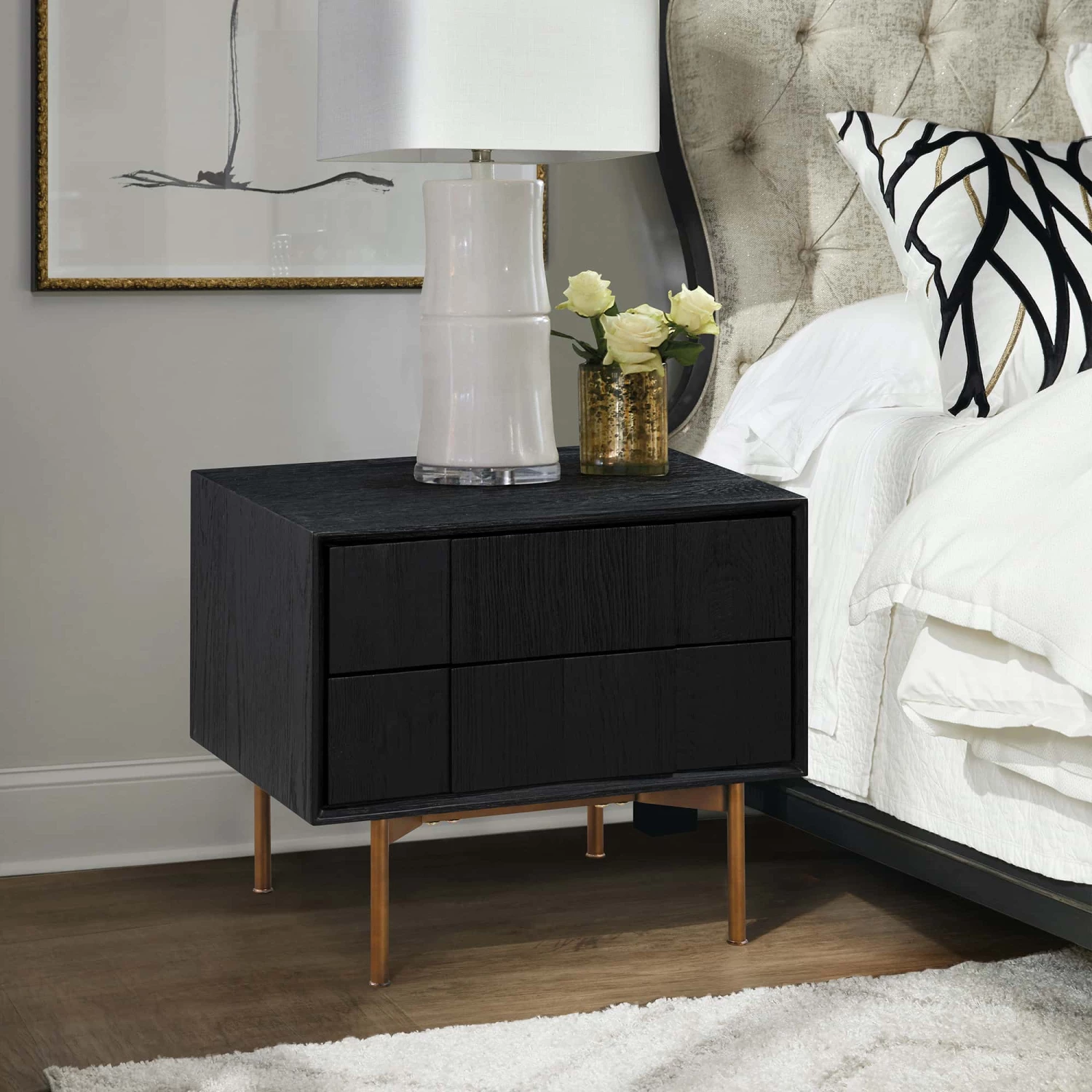 Bring endless charm to your bedroom with our Carnaby 2 drawer nightstand in black brushed oak. With each piece cut and layered onto the facade, the nightstand effortlessly achieves a sleek and artistic look. It is brushed with a black finish to gracefully accentuate the rich organic grains of Oak. Charming and sophisticated, our side table remains elevated on slender metallic legs. The Carnaby nightstand can be used in multiple settings. Oak is a highly durable hardwood used for thousands of years. It has a unique grain pattern derived from the rings of the oak tree. It contains high levels of tannins, allowing the wood to resist insects, mould, and fungus naturally. This can be used traditionally as a bedroom nightstand, provide extra surface space as an end table, or maximize storage in your home office. It features two roomy drawers to keep all your essentials within easy reach while lending modern flair to your bedroom.