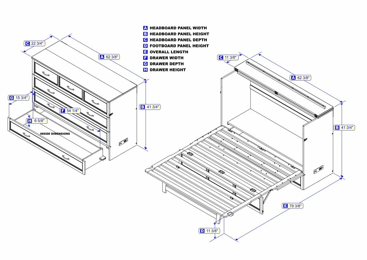 - Queen: 62 3/8″W x 22 3/4″D x 41 3/4″H; Length (Open): 79 3/8″; Drawer: 54 1/4″W x 15 3/4″D x 6 5/8″H