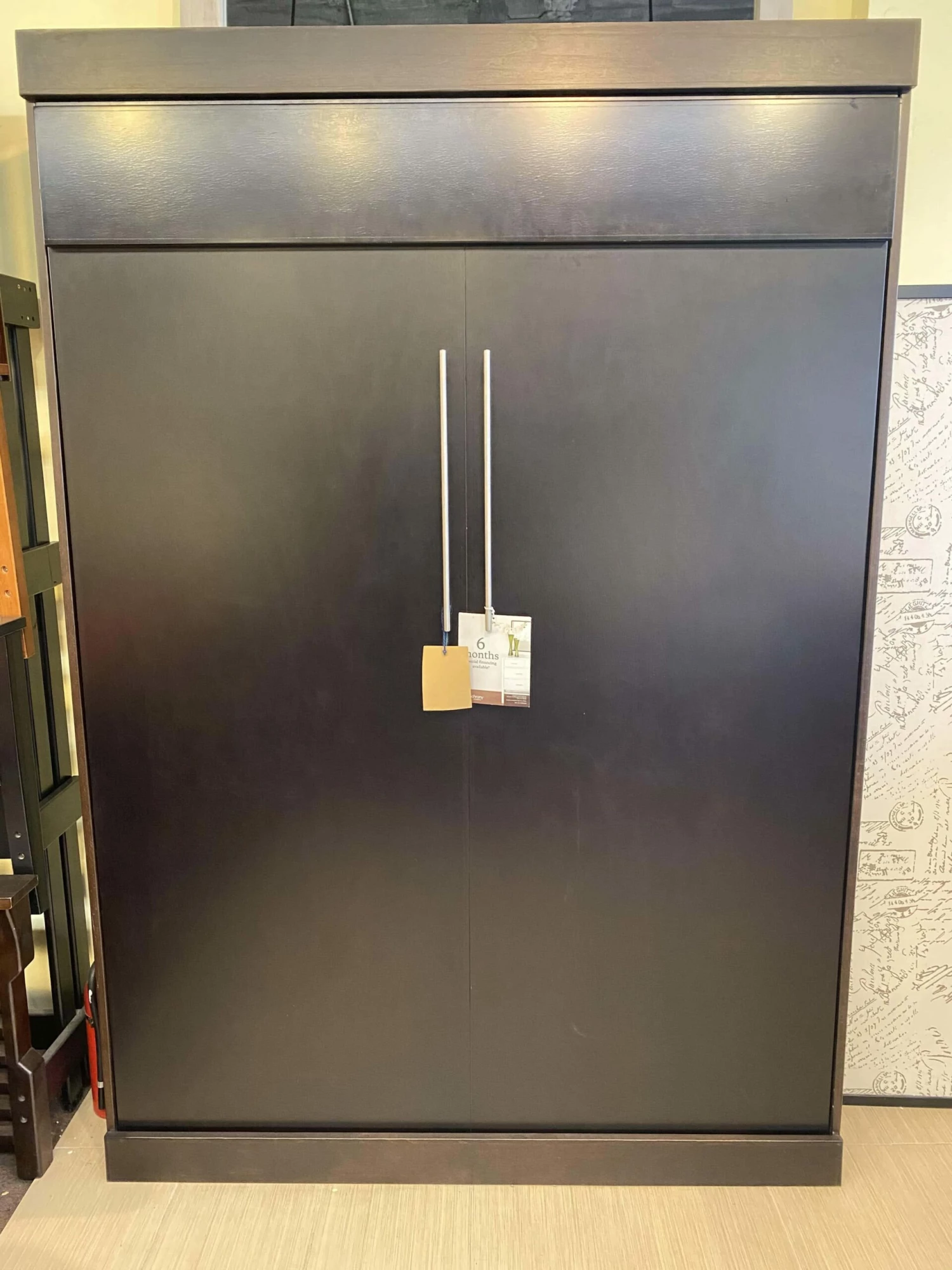 The real wood Euro Wallbed gives your room the contemporary look you are after. Solidly constructed in the US. with real hardwood solids and veneers, results in a high quality piece of furniture that is built to last. A ten step hand rubbed finish gives the Wallbed a smooth surface with even color tones. All hardware is pre-mounted making this the easiest Wallbed to assemble with just 14 bolts and an allen wrench. The Euro features stainless bar handles. State of the art piston lift mechanism makes operation of the Wallbed nearly effortless. Simply lift the panel foot to release the safety latch to lower the bed.