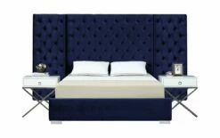 Rejuvenate your bedroom space with this Grande Navy Blue Velvet bed. Svelte velvet covers each inch of this magnificently styled bed, lending it a bit of softness and glamour. The bold headboard is heavily button tufted for a regal and sophisticated look, and it’s padded, so you can rest your back against it while you read or watch TV. The full-framed base is modish and sleek and provides sturdy support for the mattress of your choice.