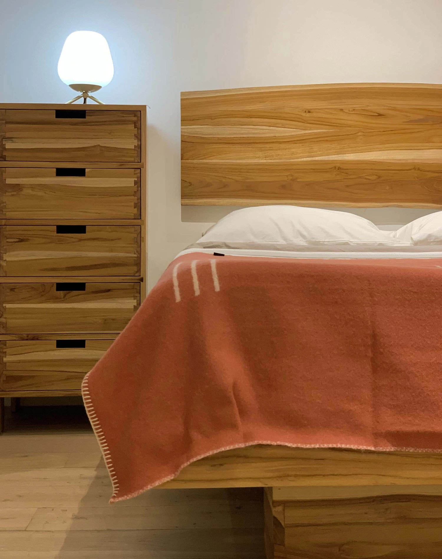 With joined planks and a live edge top and bottom, the each Kali live edge headboard’s silhouette is slightly unique. Made for a queen sized bed frame, the Kali headboard floats gently along the wall from a french cleat of the same material. Pairs perfectly with the Elate Storage Bed.