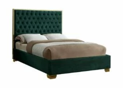 Make the Lana green velvet bed part of your dream bedroom setup. This bed has all of the bells and whistles you want, including a super tall headboard that stands nearly five-feet tall. The bed is covered in green velvet fabric for a luxe look, and it’s deeply tufted for added luxuriousness. The headboard is soft and welcoming against your back and head as you read or watch TV in bed, and the bed rests on gold legs for dependable sturdiness and durability. Use it without a box spring or foundation, since the slats are included.