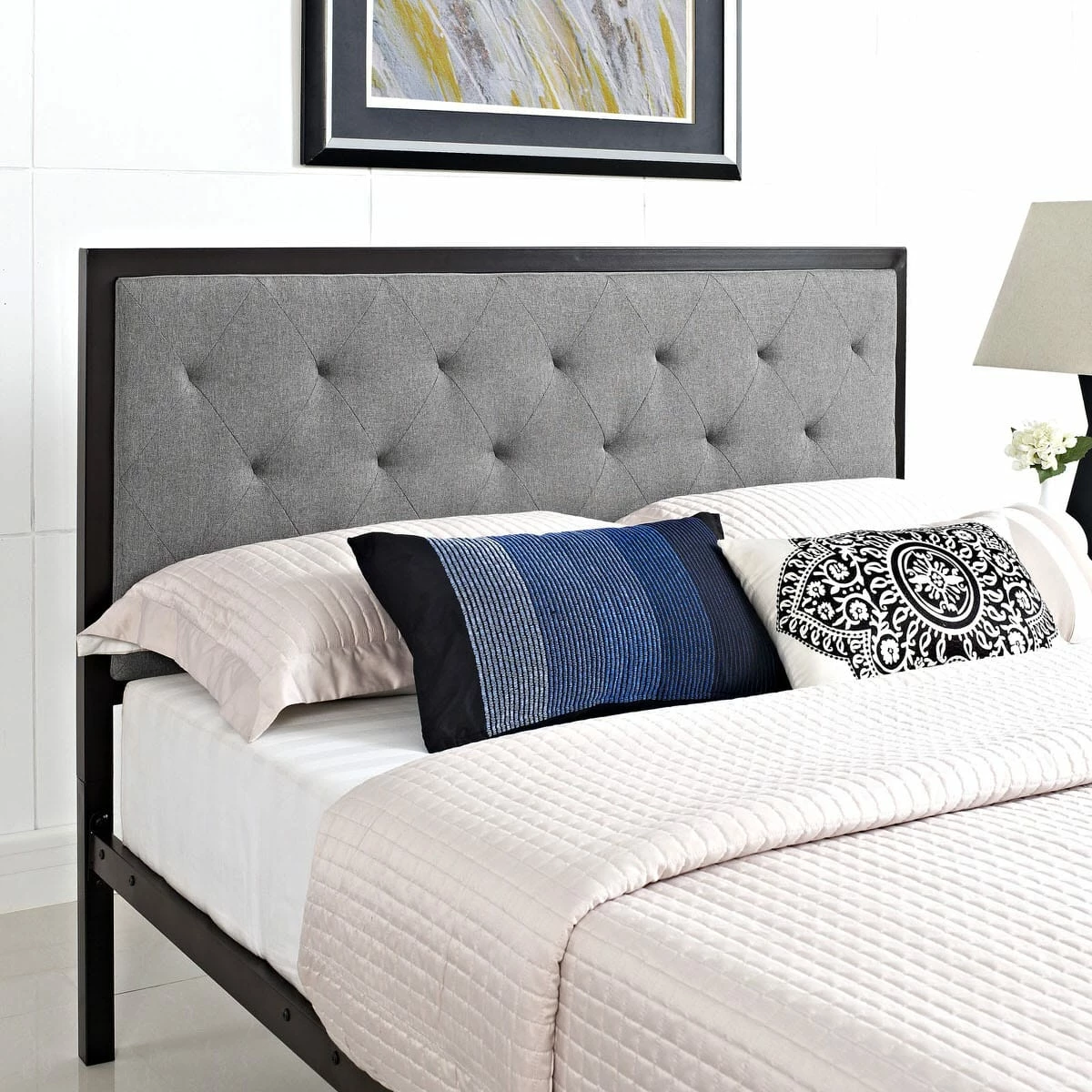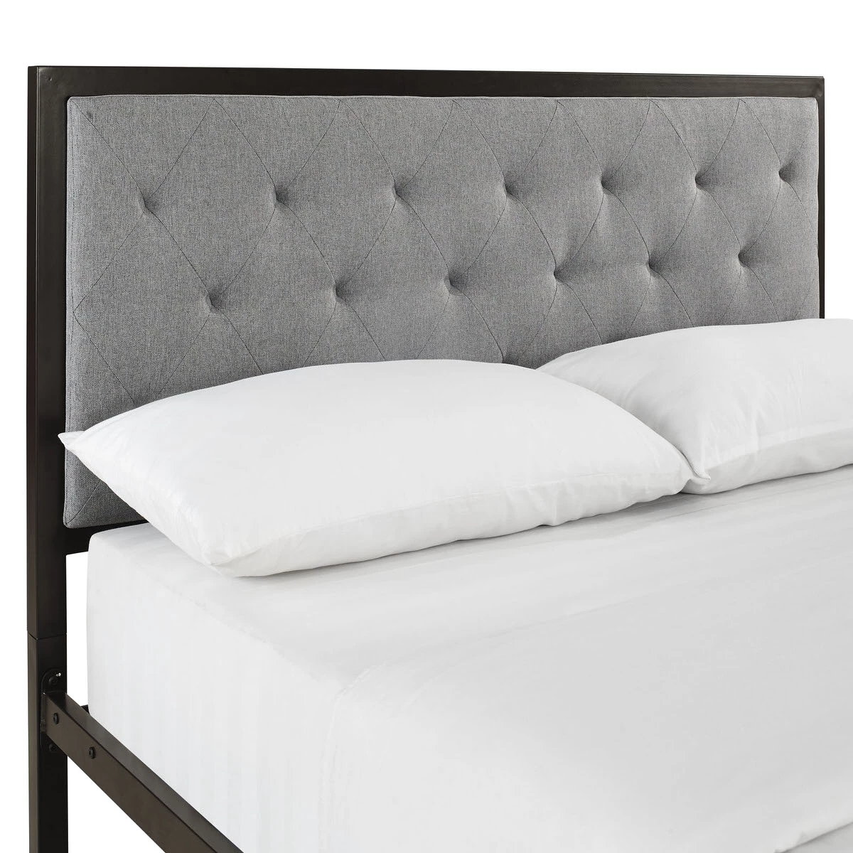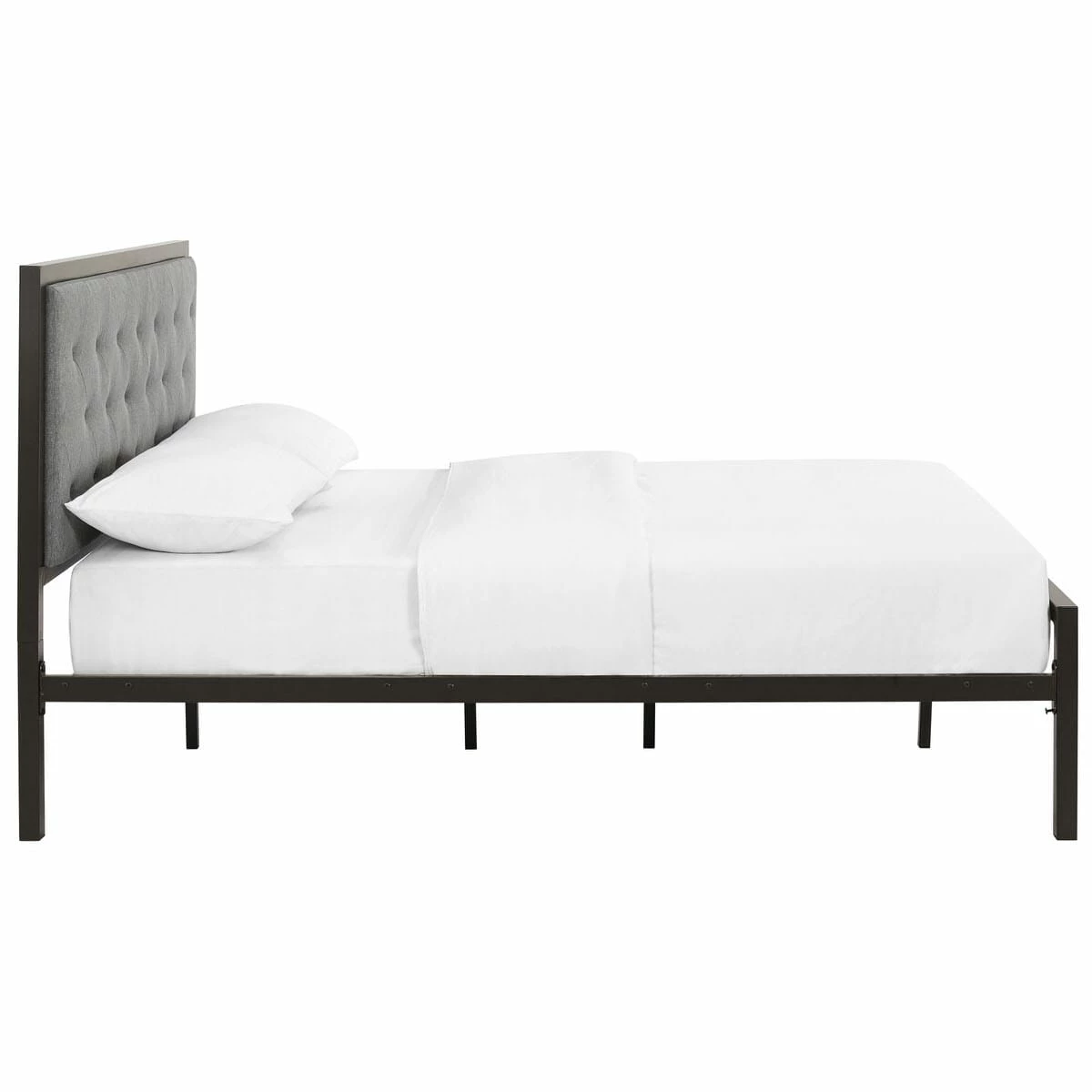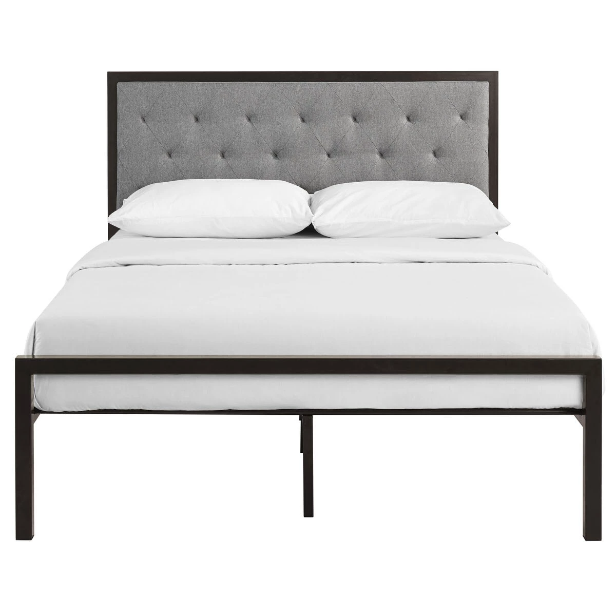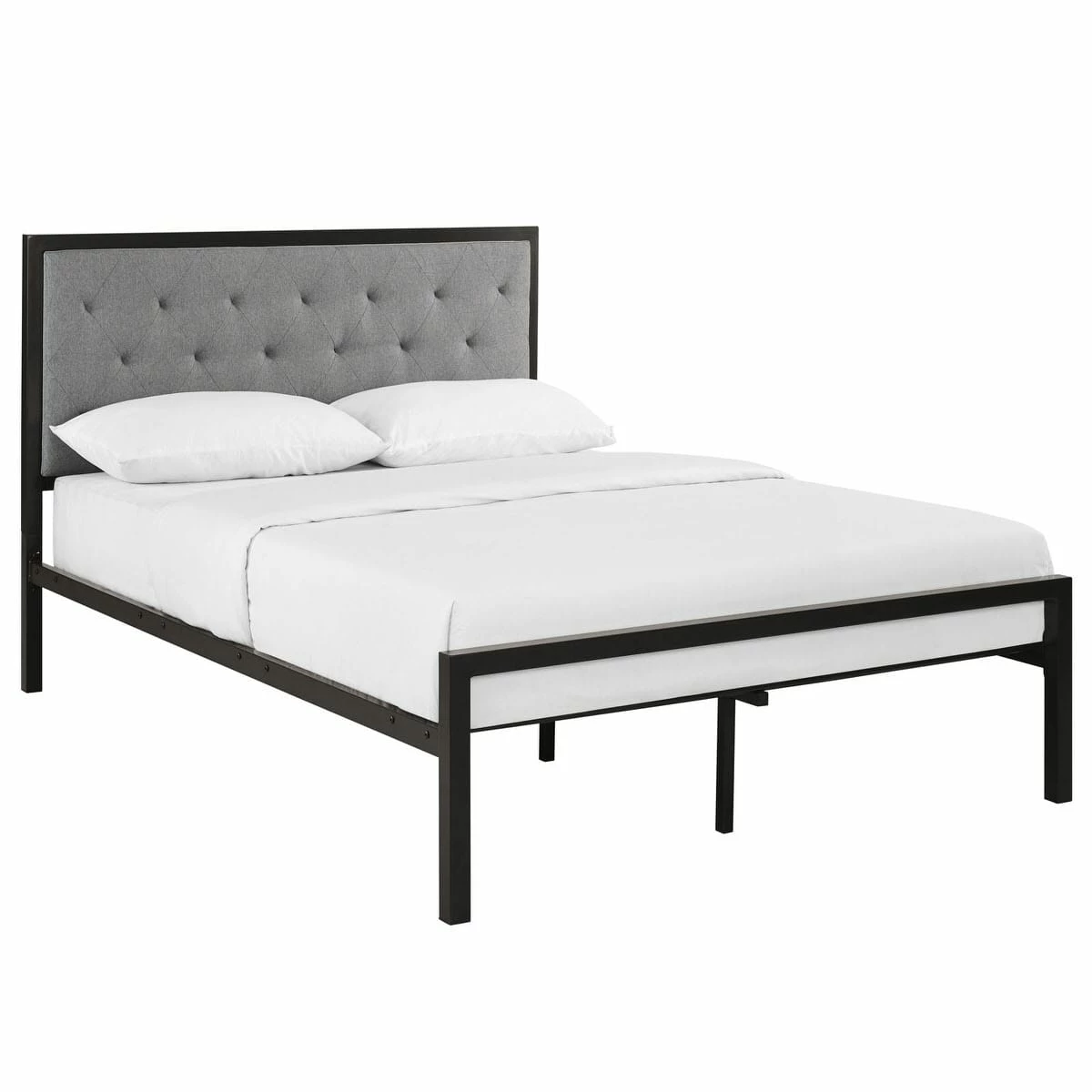 Sleep peacefully with a platform bed solid in both style and construction. Mia comes with a powder-coated steel frame that offers sturdy and long-lasting support, while the fabric headboard with deep tufted buttons add a touch of magnificence to an otherwise minimalist design. The Mia Platform Full Bed does not require a box spring. Full mattress not included.
