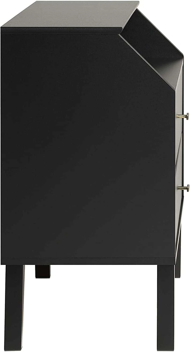 With a mid-century modern aesthetic, the Milo 2-drawer Nightstand with angled top evokes a cool retro vibe. The two-tiered top shelf provides more space for tabletop items like your phone, lamp, clock and your favorite book. The main shelf features cable management for your electronic devices while the two drawers provide ample storage for bedside essentials. The tapered solid wood legs and inset drawers deliver a clean and modern look to your bedroom. Brushed brass finished knobs add to the retro-chic design for a functional and fashionable dresser. Style this dresser on its own, or combine it with any of the products in the Milo collection for a timeless look.