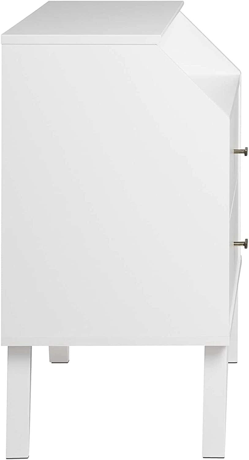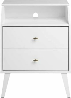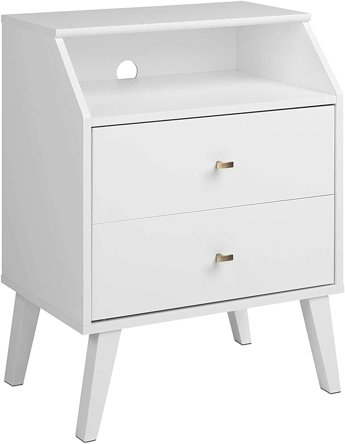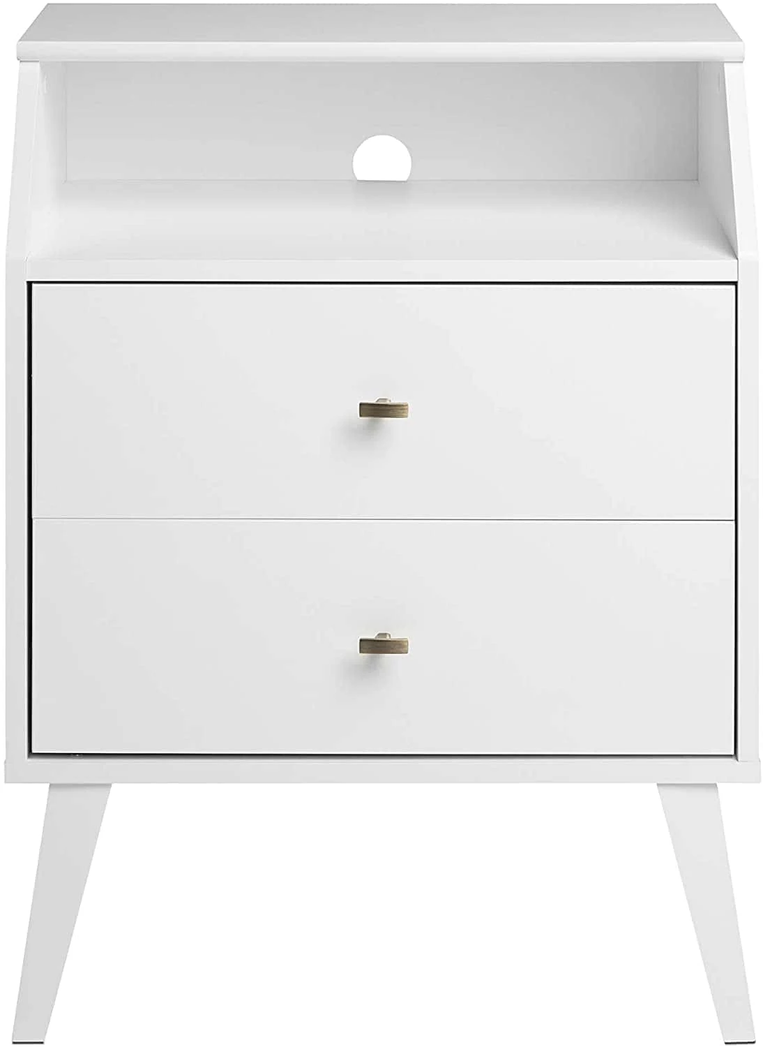With a mid-century modern aesthetic, the Milo 2-drawer Nightstand with angled top evokes a cool retro vibe. The two-tiered top shelf provides more space for tabletop items like your phone, lamp, clock and your favorite book. The main shelf features cable management for your electronic devices while the two drawers provide ample storage for bedside essentials. The tapered solid wood legs and inset drawers deliver a clean and modern look to your bedroom. Brushed brass finished knobs add to the retro-chic design for a functional and fashionable dresser. Style this dresser on its own, or combine it with any of the products in the Milo collection for a timeless look.