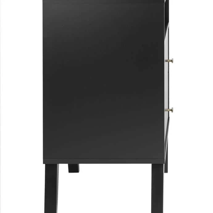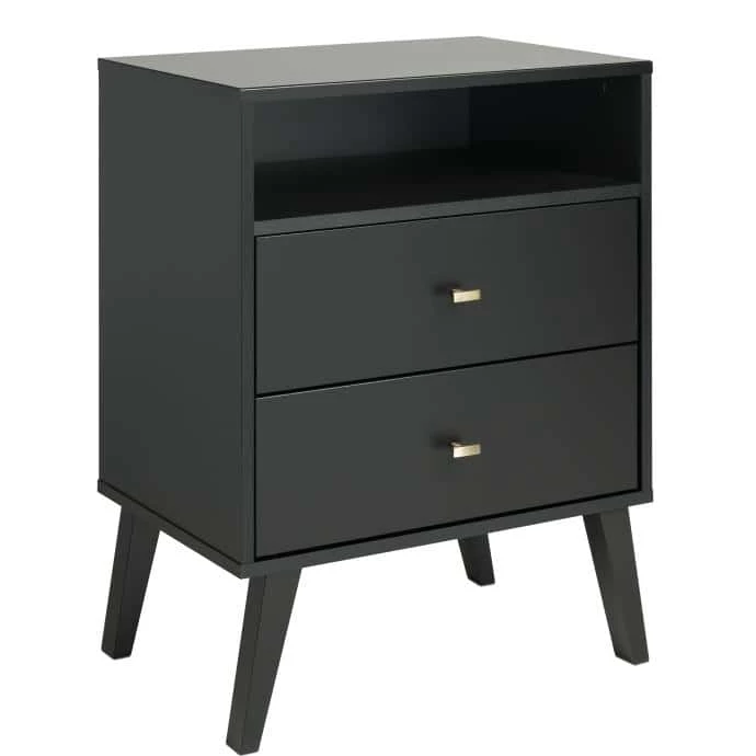 The Prepac Milo 2-Drawer Nightstand with Open Shelf is a modern take on a retro look, with a sleek mid-century modern design that adds a touch of vintage styling to your bedroom. Two full sized drawers provide ample room for all your bedside necessities and the open shelf is perfect for anything you need easy access to. The tapered solid wood legs and inset drawers deliver a clean and modern look to your bedroom. Brushed brass finished knobs add to the retro-chic design of this functional and fashionable nighstand. Style this nightstand on its own, or combine it with any of the products in the Milo collection for a timeless look.
