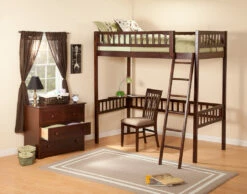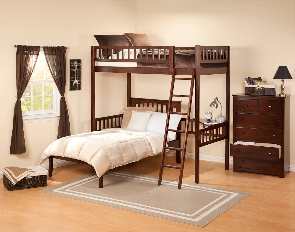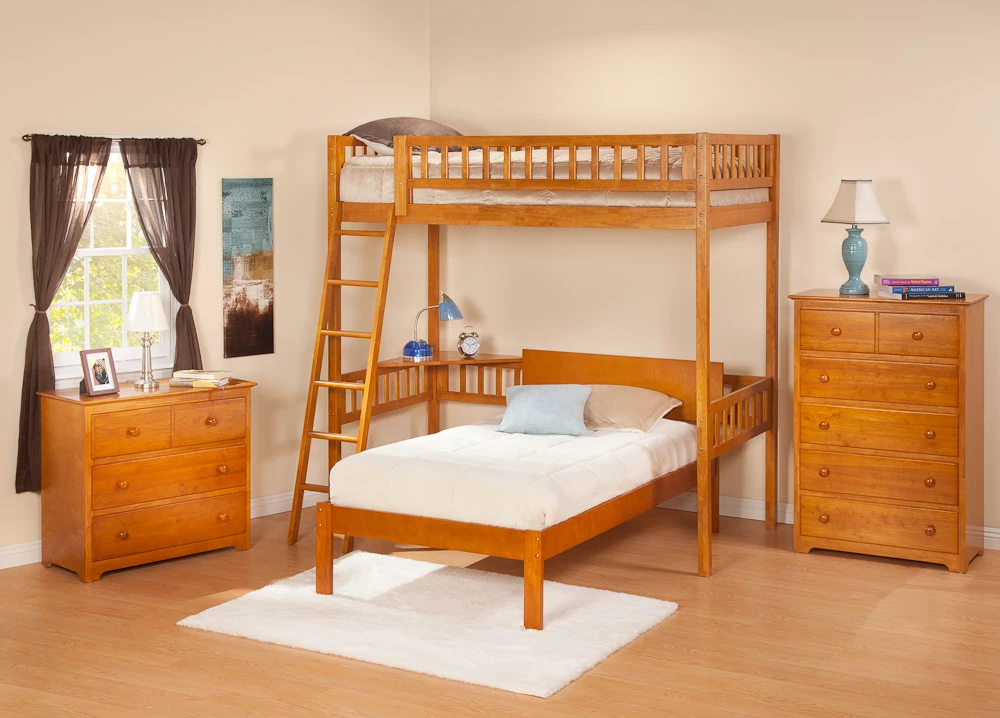 Our high mission loft includes a corner workstation which adds stability and provides a place to write or work on your notebook computer or tablet. Constructed of eco-friendly solid hardwood this bunk offers plenty of headroom. Add any Atlantic Furniture twin or full bed, chair, nightstand, chest or dresser to increase your sleep and study space.