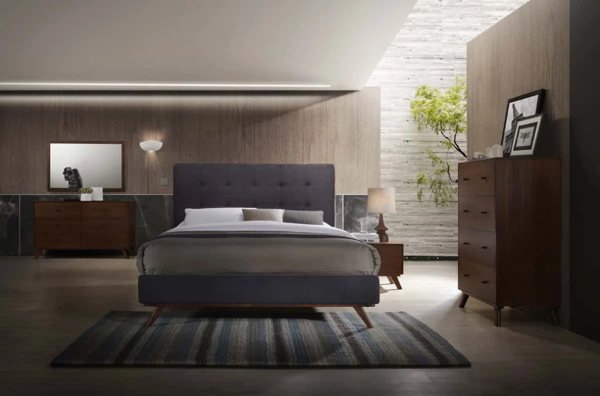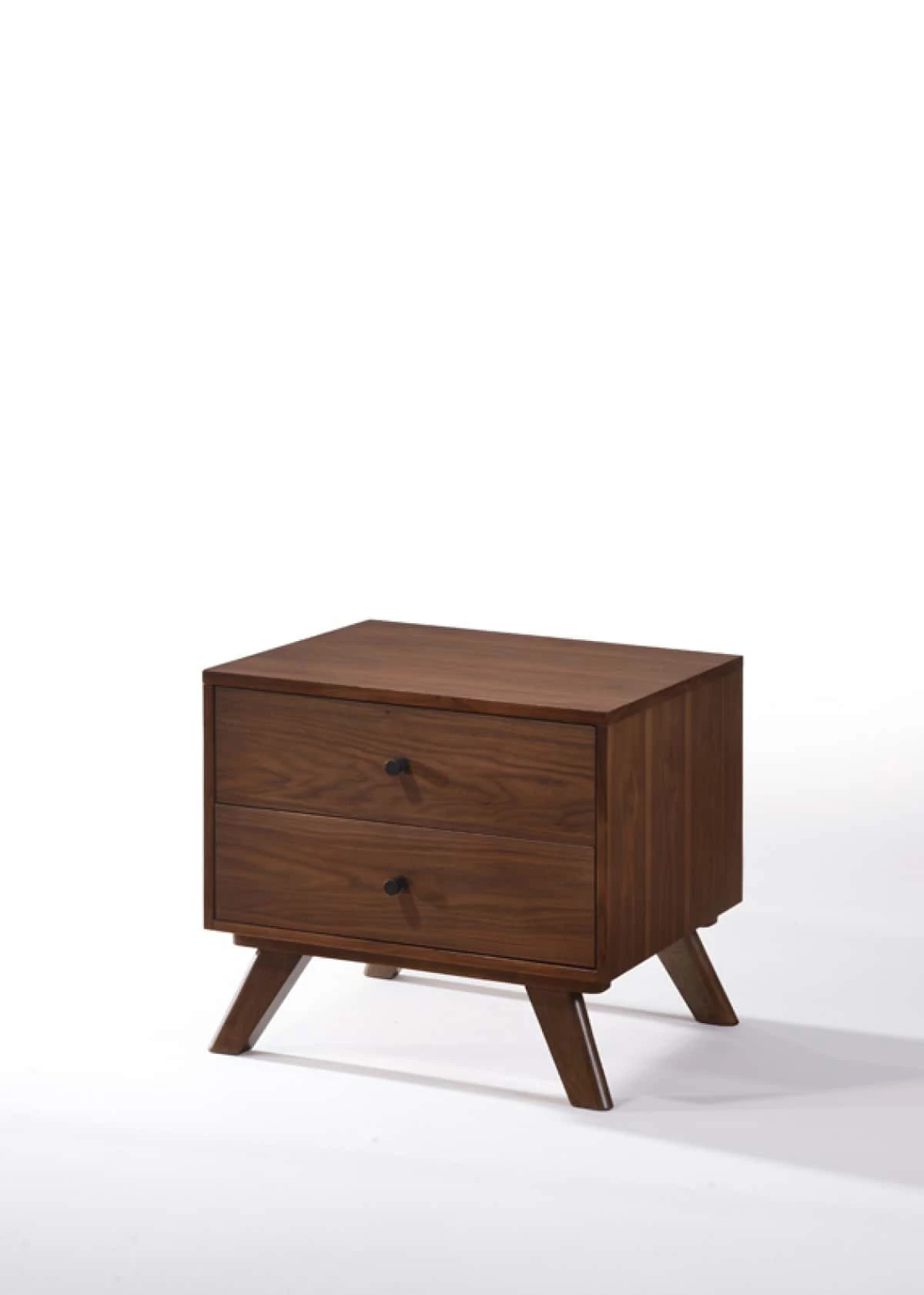 Keep essential items handy while sleeping or resting with the Modrest Addison Mid-Century Modern Walnut Nightstand in shiny Walnut Veneer finish. For functionality, it features 2 capacious drawers with jutted dark Walnut pulls. Wood markings on the surface added to its beauty. This mid-century modern nightstand stands on tapered durable Walnut finished solid Rubberwood legs.