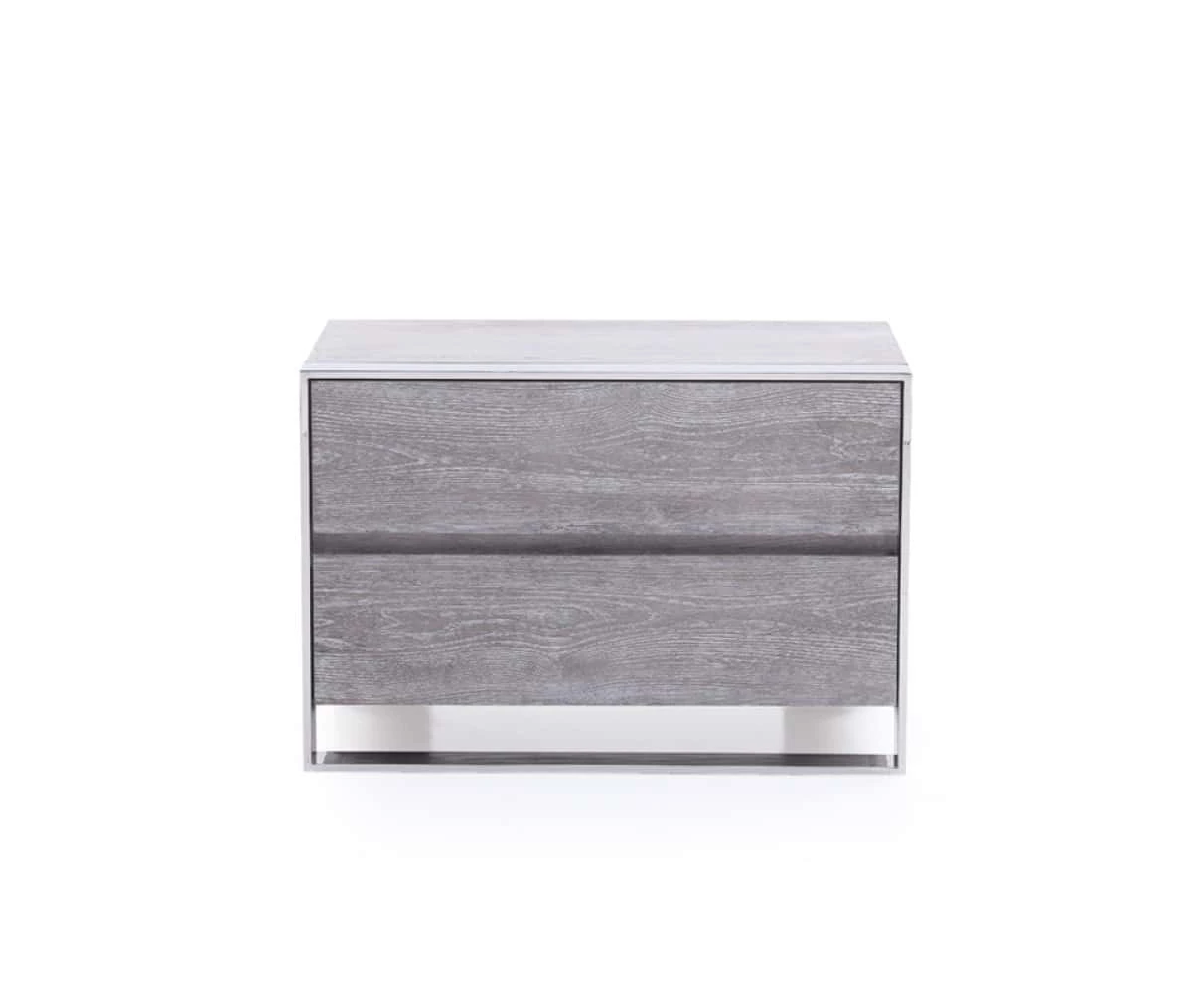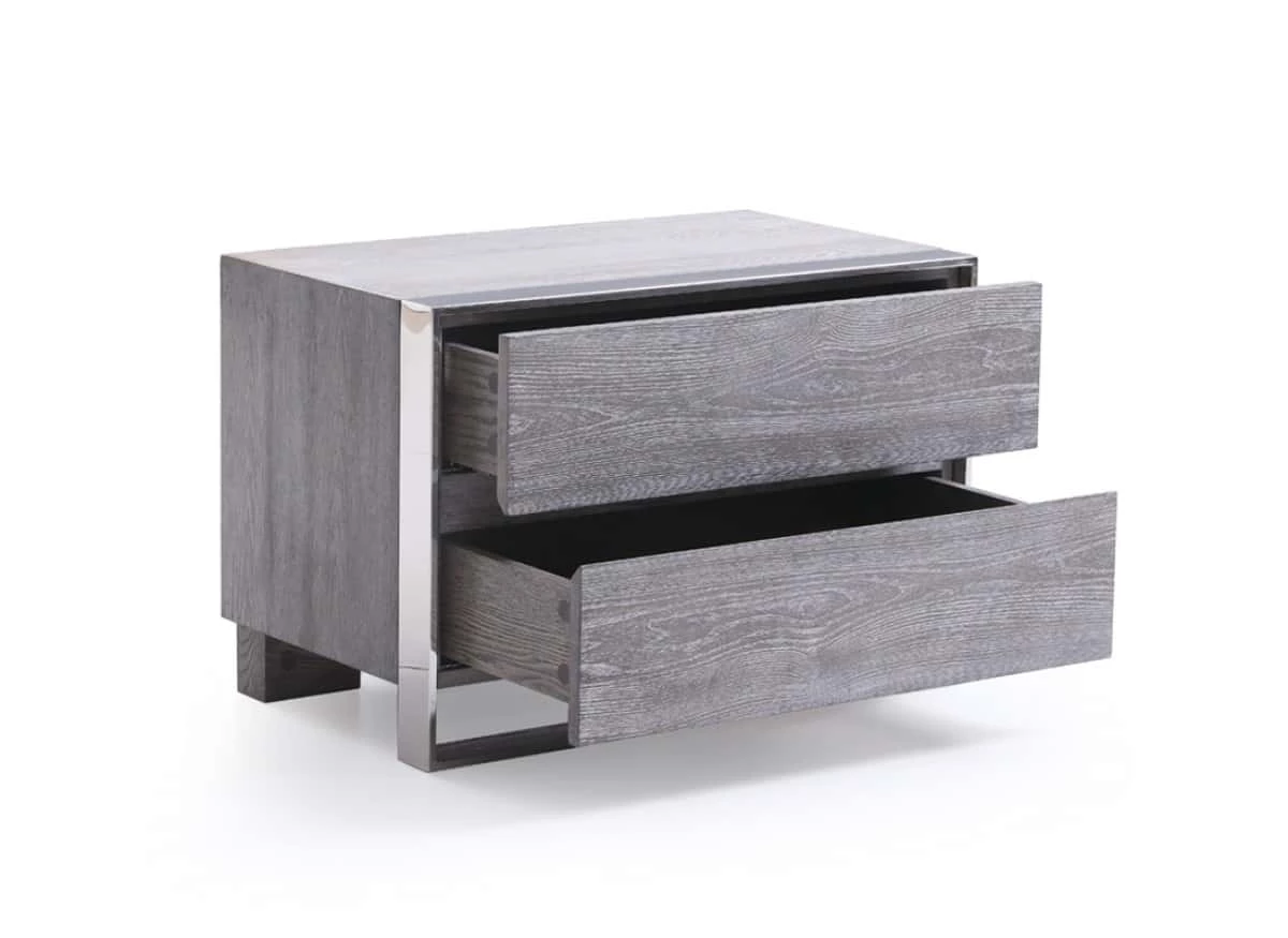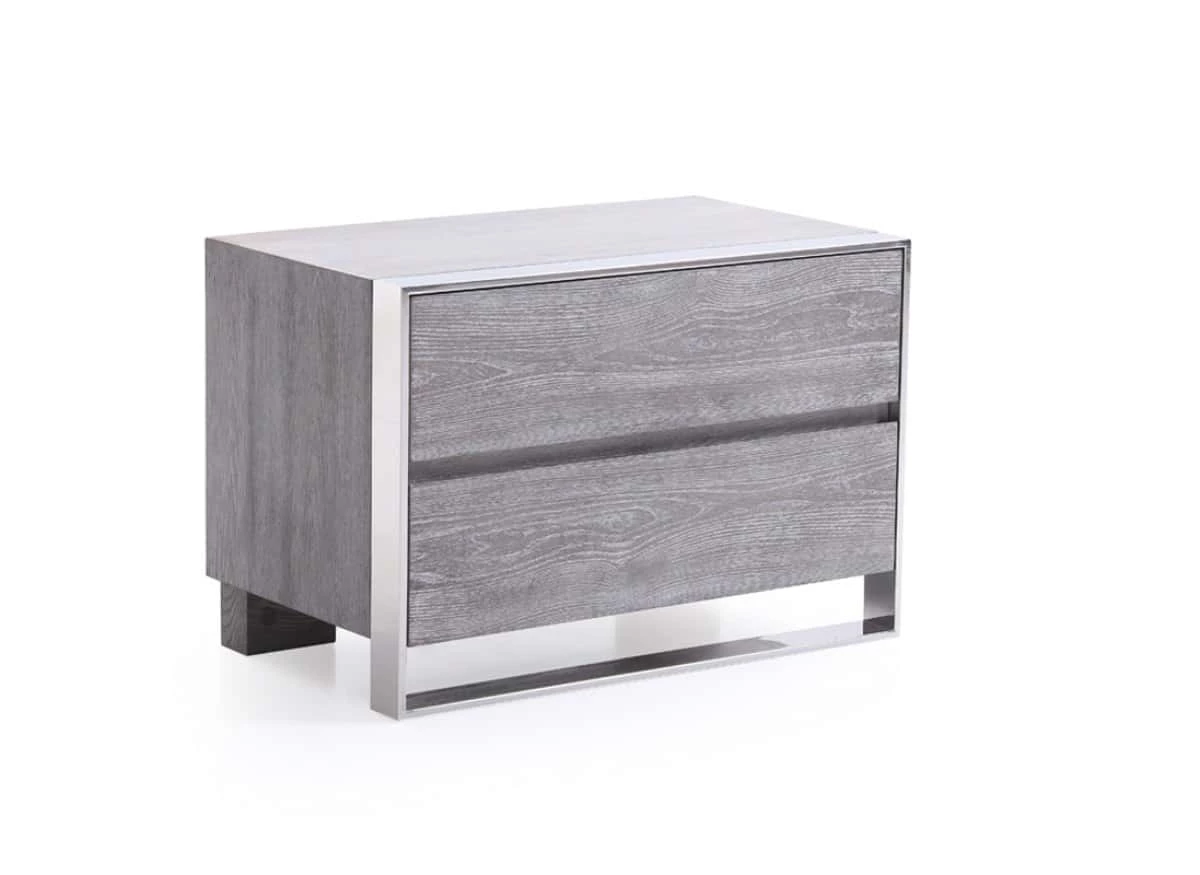 Fitted with 2 soft-closing drawers, the Modrest Arlene Modern Grey Elm Nightstand is all you need to keep items handy while in bed. A lustrous stainless steel that extends to the floor frames its front and functions as its front legs, giving it an interesting chic appeal. Wood grains on the surface added interest while wood legs give support at the back.