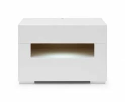 An LED light in the top cubby provides not only accent lighting but functional lighting for early morning or night time use. Two drawers administer abundant storage for your reading glasses and favorite book. Finished in a white gloss for a clean and contemporary design. Matching set pieces available separately. Available in a brown oak wood veneer finish.