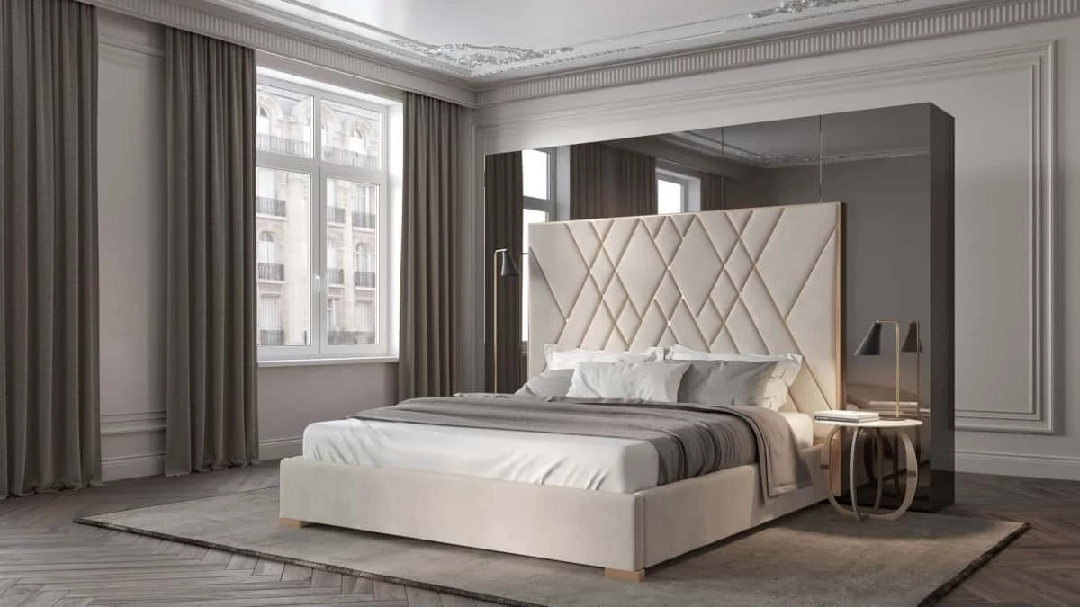 The Eldora Bed is a stylish modern bed with glam materials that brightens up any space. A beautiful beige velvet fully upholsters the frame of this tall bed. Brushed brass inserts create a geometric pattern that adds visual interest. Brushed brass is also accented on the low profile legs. Perfect for a contemporary bedroom.