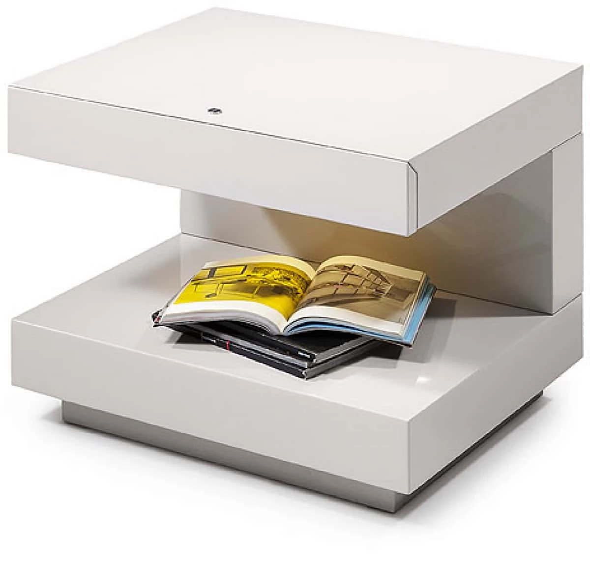The Modrest Esso modern white glossy nightstand features a smart open cube design with a single drawer and an open shelf beneath it offering more storage. It has a sturdy construction and stand on a low base, exhibiting a low to the ground presentation that completed its unique and elegant style.