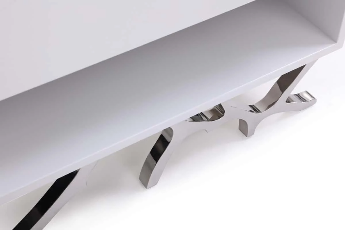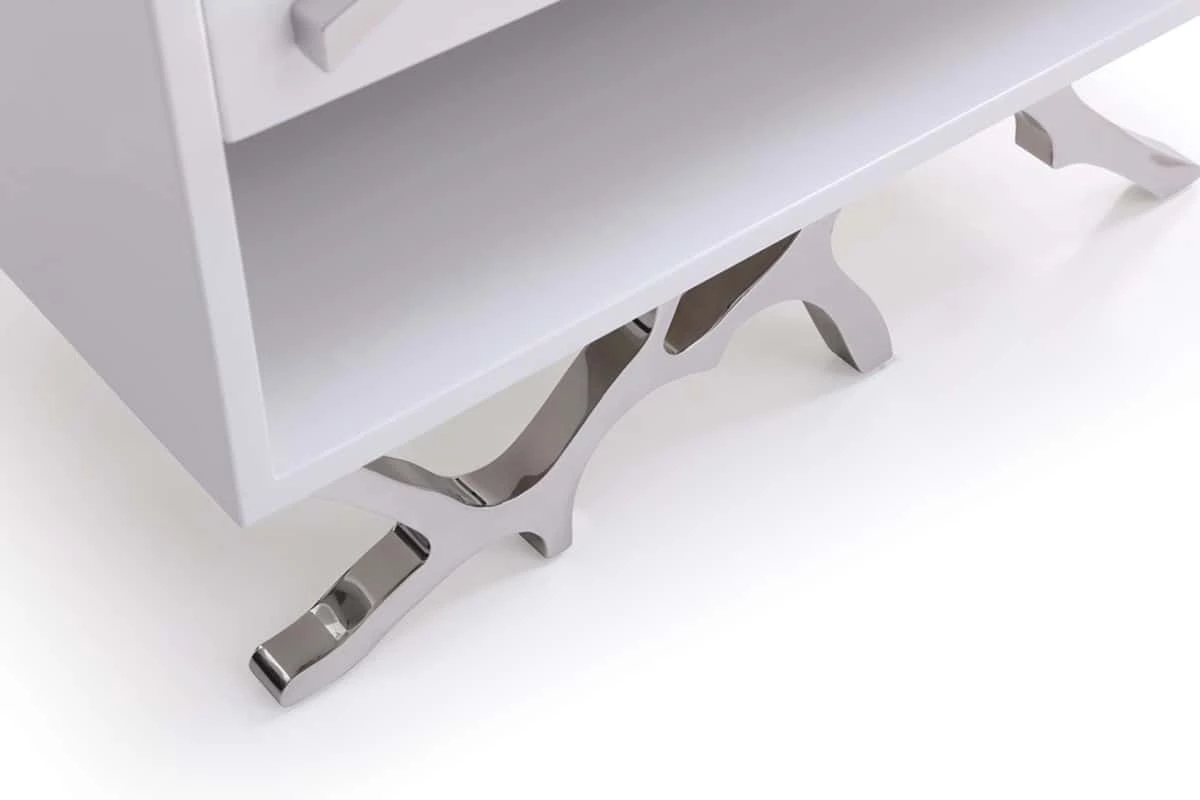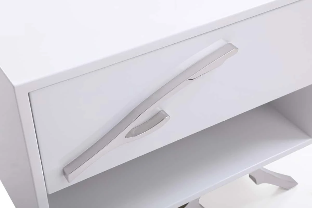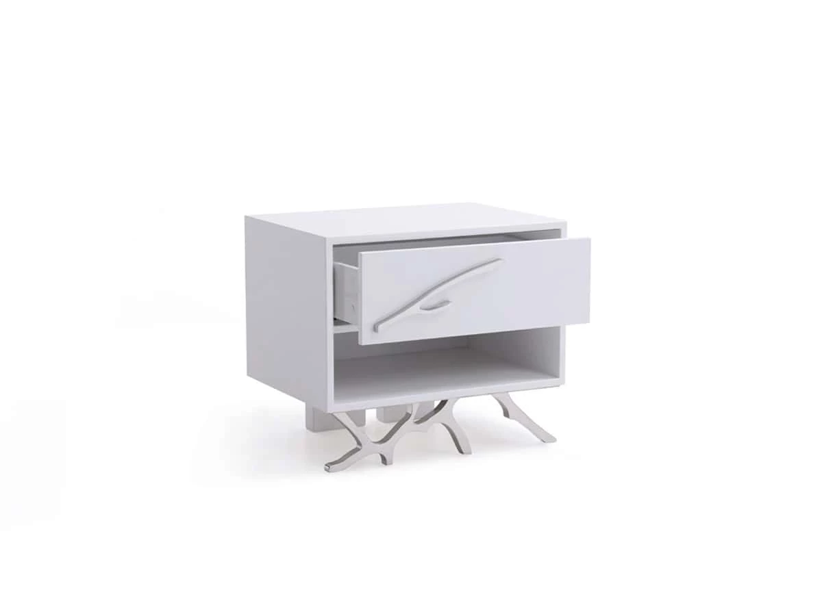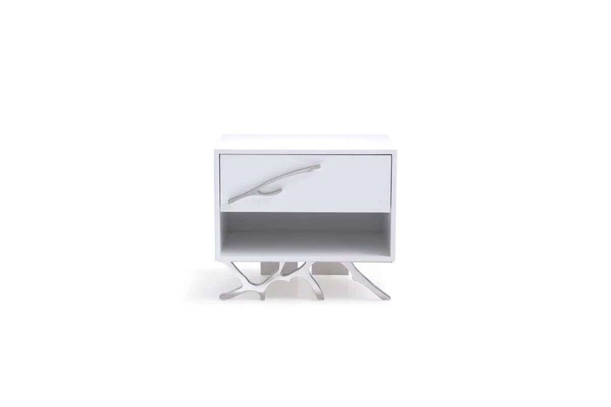 Take a classic design and give it a glam twist and you have the basis for the Legend Nightstand. This high-gloss white nightstand includes one soft-closing drawer with a special twig-shaped handle and an open storage cubby below. This handle and a similar branch motif that make up the legs are made from polished stainless steel to keep a modern flair on a rustic design touch.