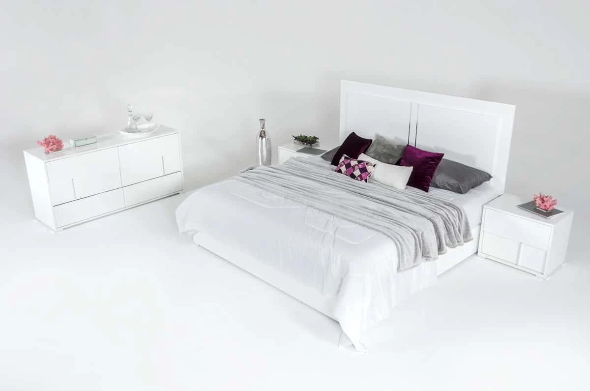 The Modrest Nicla Italian Modern White Bed gives your room a charismatic feel featuring a lustrous white gloss finish bed frame and headboard and cubed legs. Featuring a near-to-the-ground design, vertical chrome accents adorn the front of the headboard. Requiring assembly, this made in Italy modern bed features wood orthopedic slats that allow proper mattress aeration.
