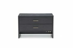The Modrest Wales Modern Grey Ash 2-Drawer Nightstand combines flair and function in its design featuring a lustrous dark grey ask veneer finish frame with wood grains. It features 2 spacious drawers with brass handles and round brass accents on the lower section of the frame. Requiring some assembly.