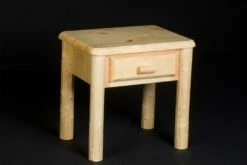 The Northwoods one drawer log night table is one of our smallest night tables, with limited storage space for personal belongings like reading glasses, a book, or other small objects. It stands distinctly on four clean peeled pine log legs, that are open underneath for ease of cleaning and storing things like slippers. This rustic nightstand is constructed of pine logs that are clean peeled by hand.