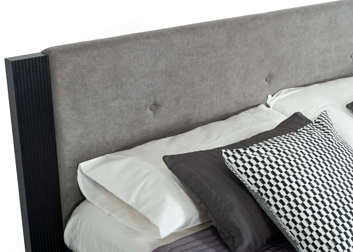 Donning a low profile design is the Nova Domus Panther Contemporary Grey & Black Bed. Constructed with an exquisite black ash veneer body, it features a 100% polyester grey fabric upholstered headboard. Making it even more enticing is the sunken slatted mattress frame that aerates and keeps the mattress in place. Vertical ridges adorn the sides of the headboards and corners of the frame. Standing on black solid rubber wood legs, this contemporary bed is your answer to having a modern and minimalistic bedroom theme.