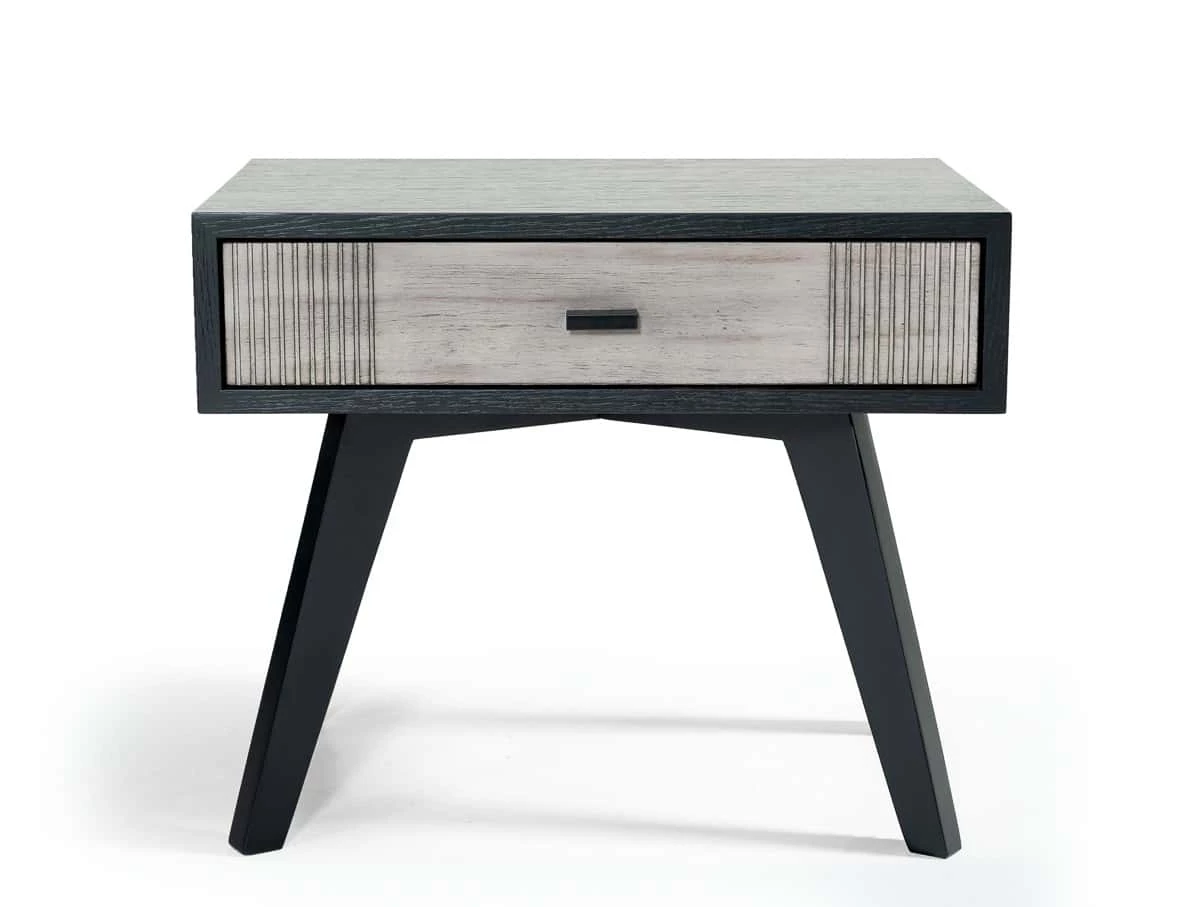 Offering accessibility when you need it most is the Nova Domus Panther Contemporary Grey & Black Nightstand. Built with tapered black solid rubber wood legs, it comes with a single easy-to-slide grey acacia drawer front with perpendicular ridges on the ends. Storing necessities within your reach, it has a black drawer handle that blends beautifully to its black ash veneer body.