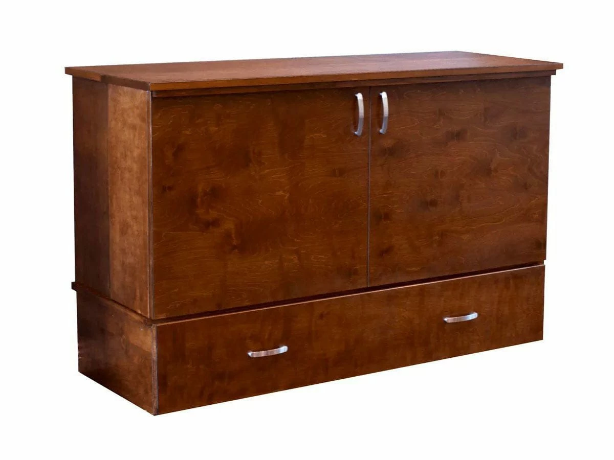 A Cabinet Bed is your space-saving sleep solution. It has a unique patented mechanism and it’s more affordable than a Murphy Bed or a Wall Bed. Cabinet Bed takes less than 10 minutes to install and can be moved easily, 6 bolts to separate it. This plywood Cabinet Bed is free-standing and doesn’t have to be screwed to the wall. It can support a 60 inch TV when closed. It has an easily opened hinged front and no mechanical parts.