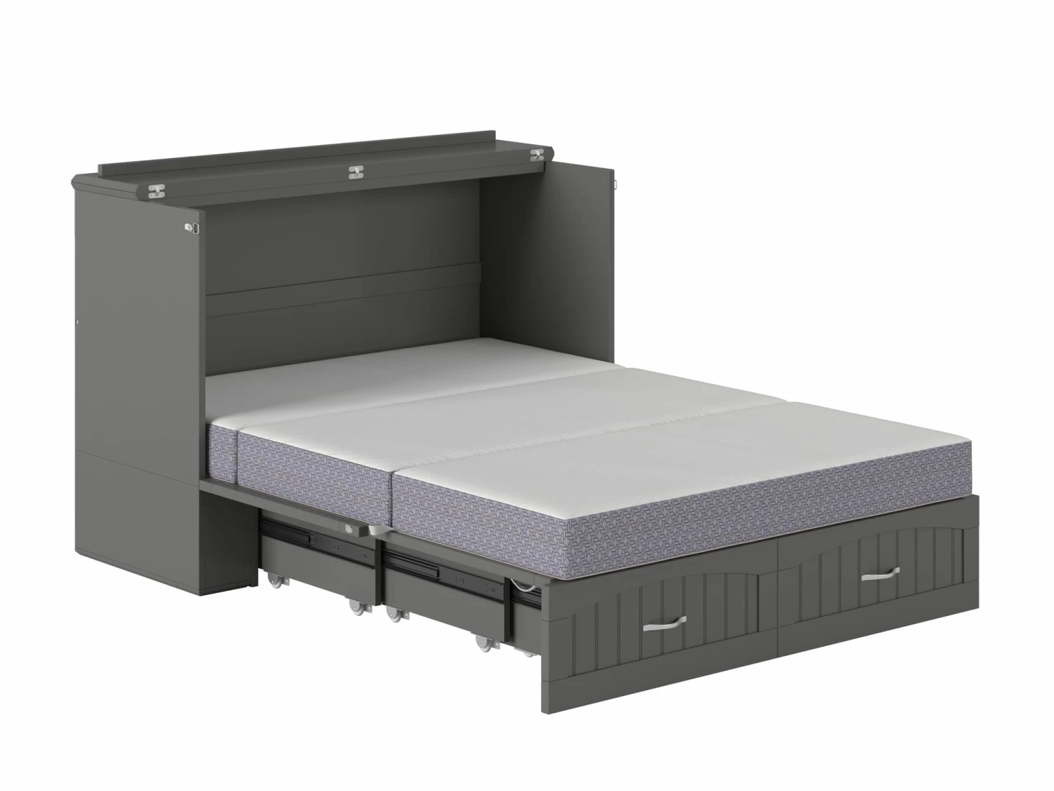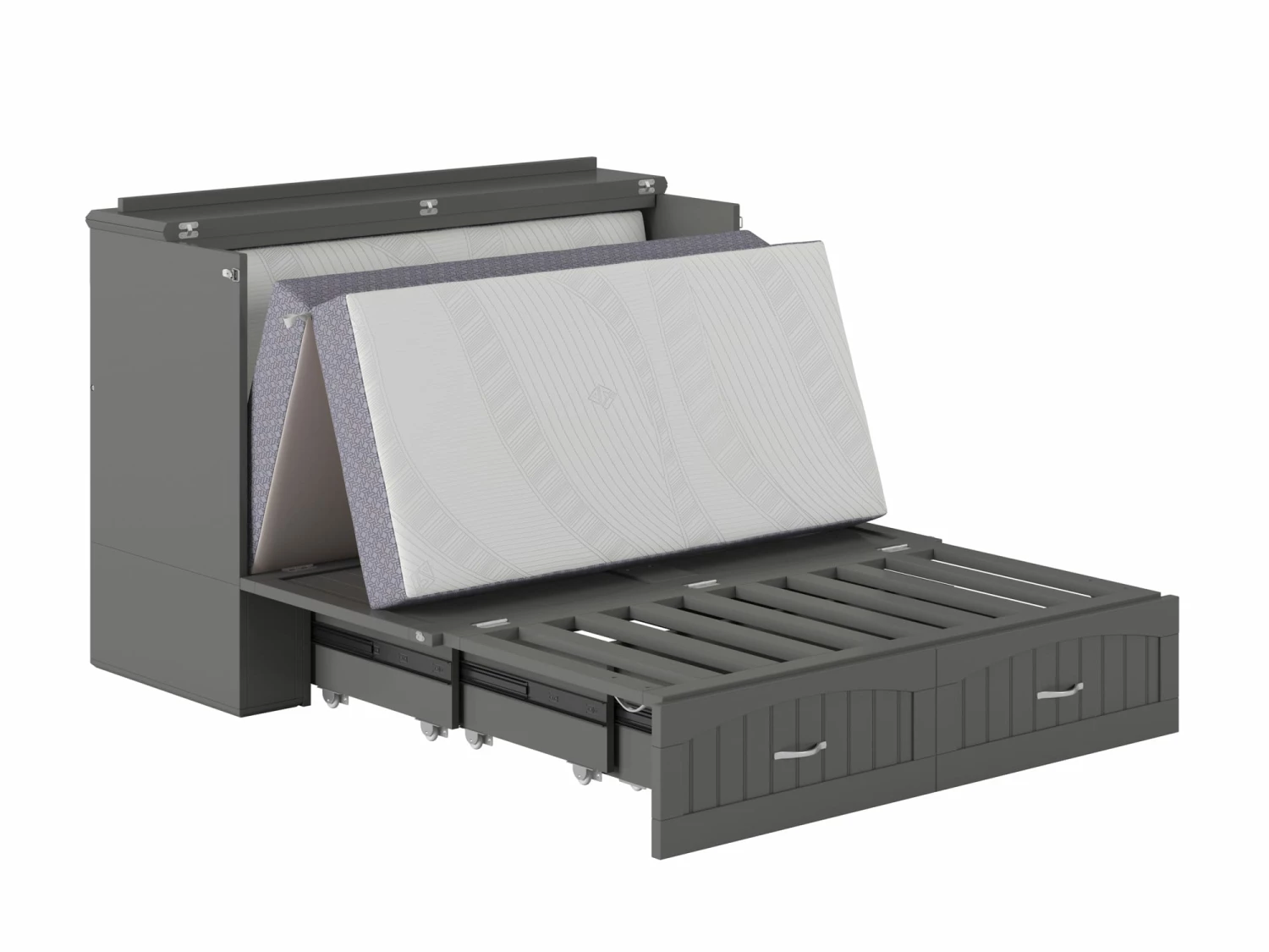 For big personalities with little room to spare: these beds are tucked inside sleek, compact chests, so you can entertain with ease. The Southampton Murphy Bed Chest is perfect for guest rooms, vacation homes, or anyone that loves to host! A folding memory foam mattress is hidden behind the cabinet’s sleek, cottage-style tongue and groove panelling. Just unlatch, unfold, and your guests have it made.