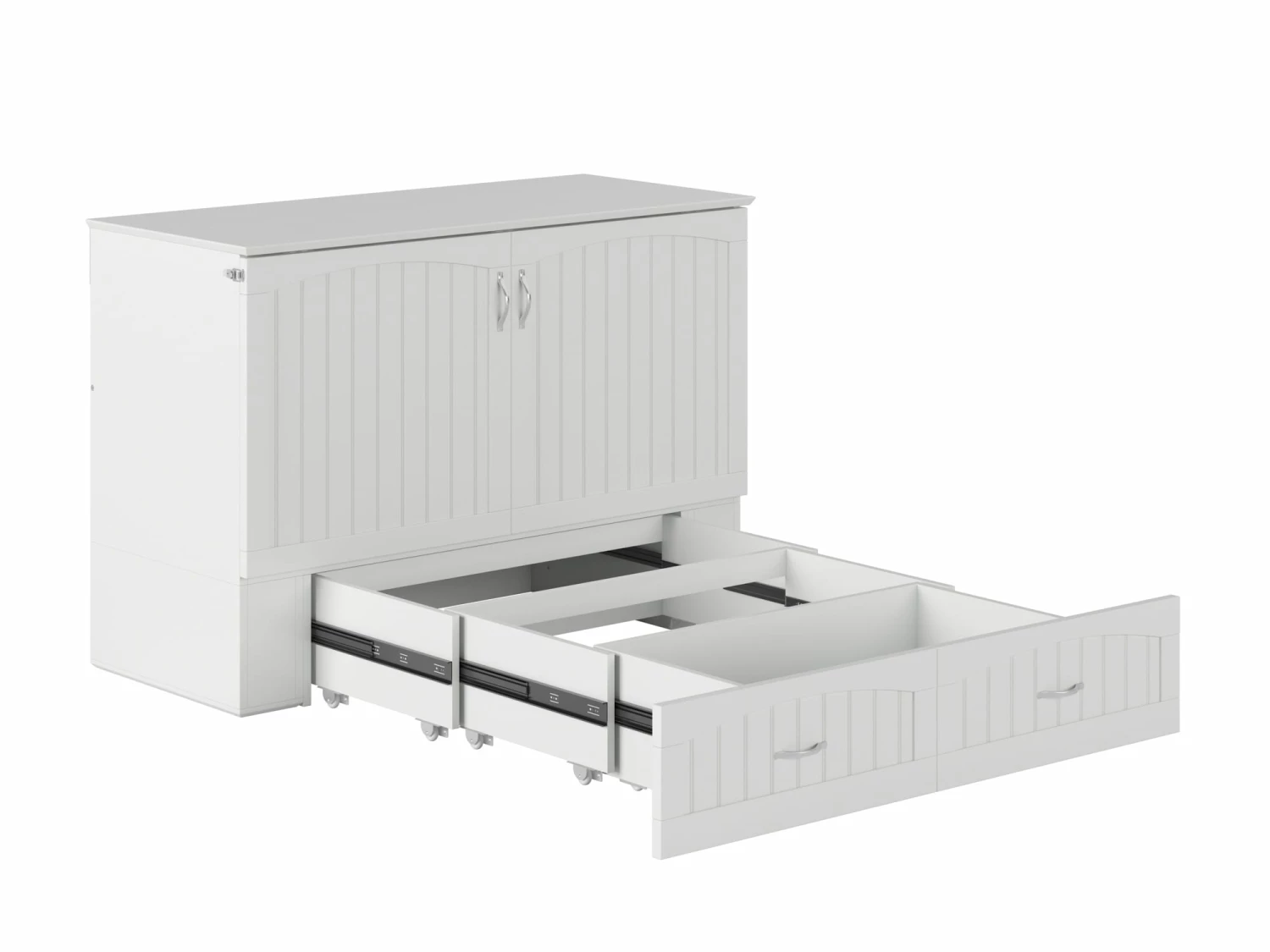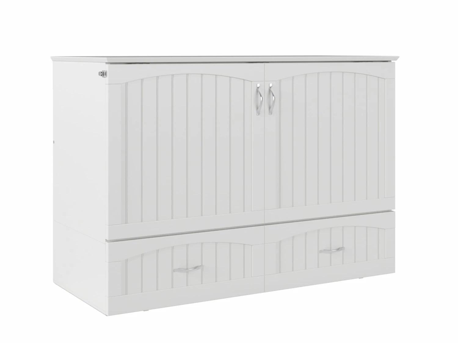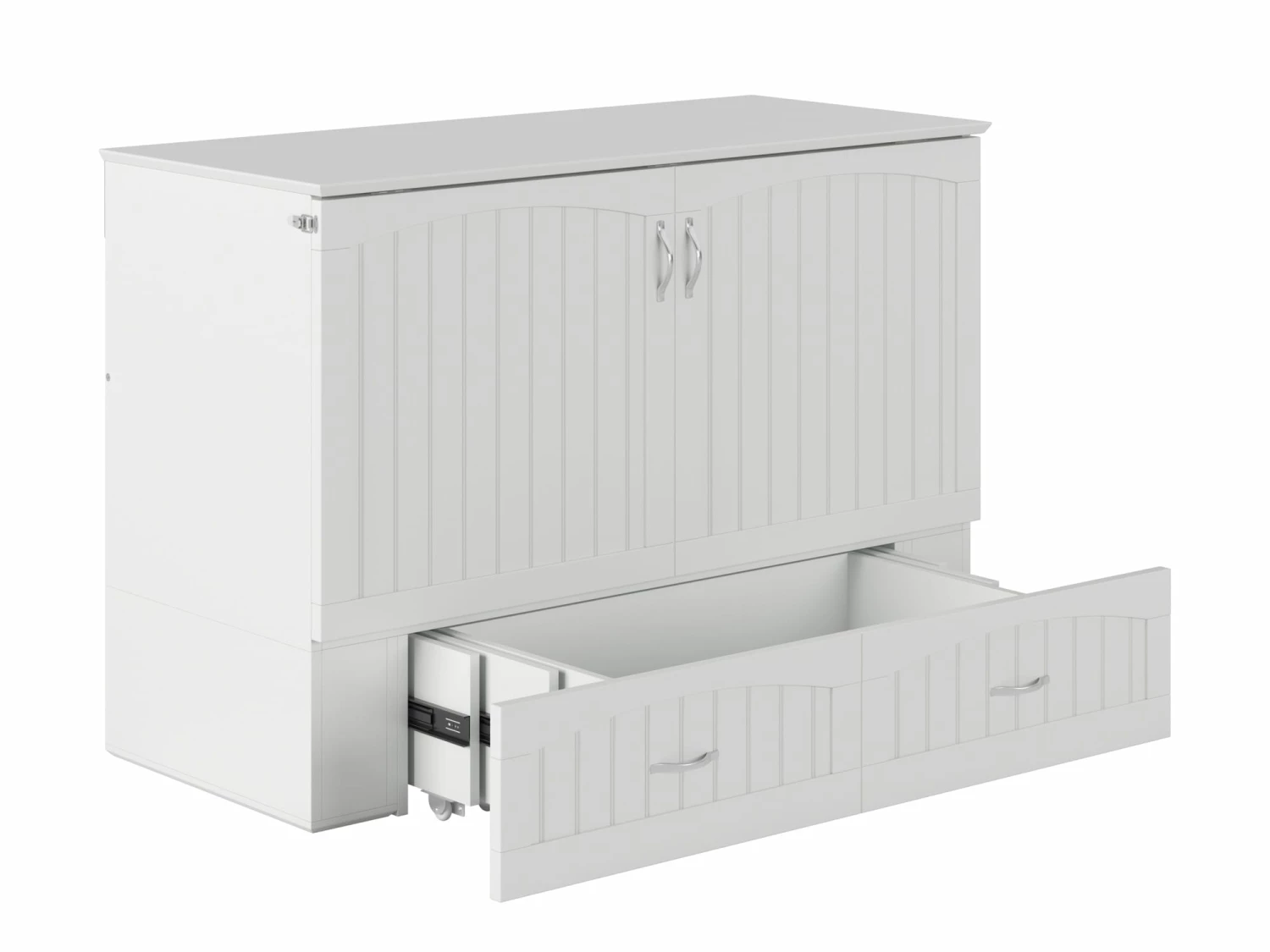 For big personalities with little room to spare: these beds are tucked inside sleek, compact chests, so you can entertain with ease. The Southampton Murphy Bed Chest is perfect for guest rooms, vacation homes, or anyone that loves to host! A folding memory foam mattress is hidden behind the cabinet’s sleek, cottage-style tongue and groove panelling. Just unlatch, unfold, and your guests have it made.