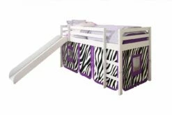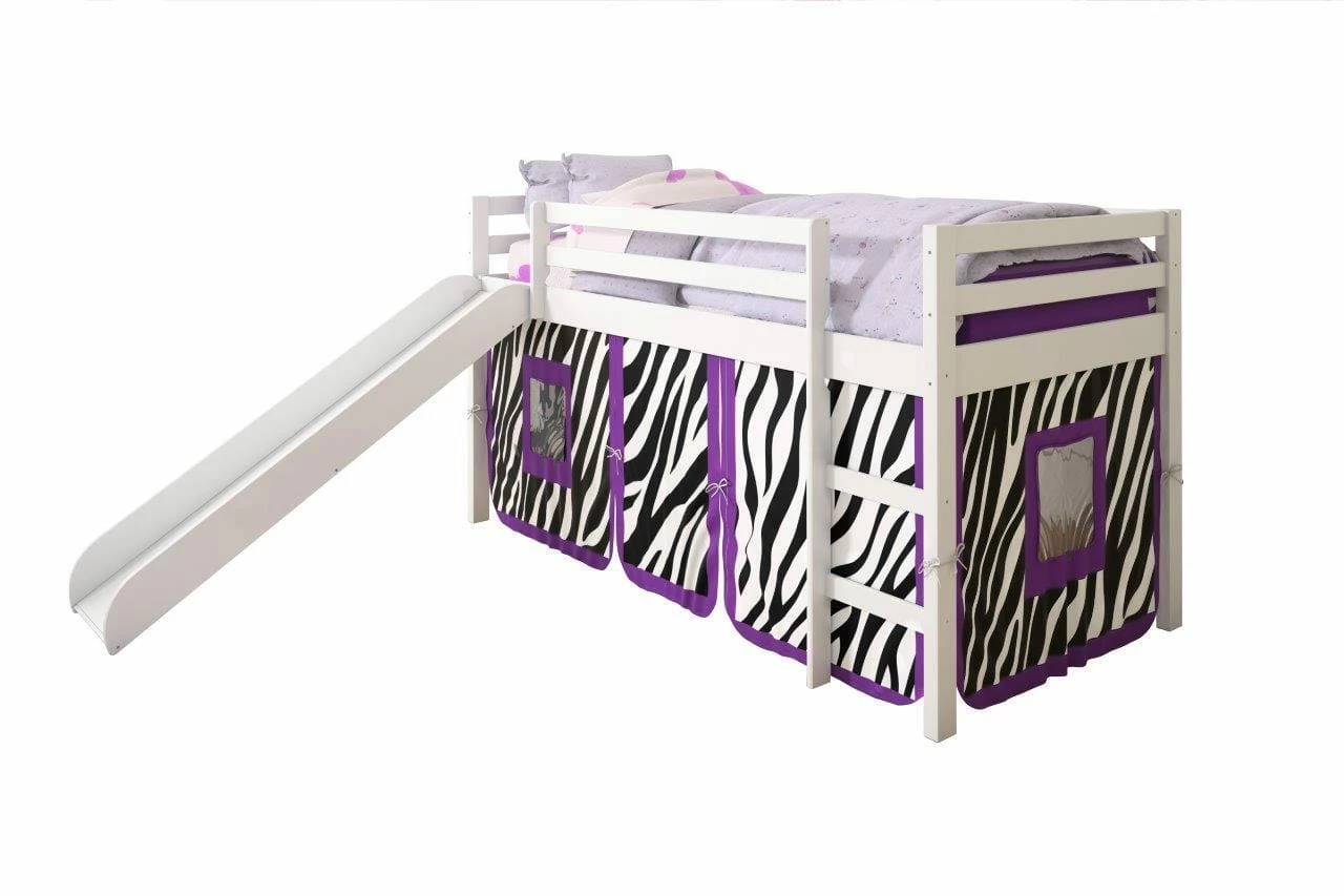 Transition your child from a toddler bed to an exciting twin low loft bed. The included slide makes it fun to get up in the morning. The timeless white finish can easily match most any decor. The bed is a great space saver in any child’s bedroom, with play area under the bed or open storage area. The zebra tent fabric can make for a fun indoor tent area or find all the stored items under the bed.