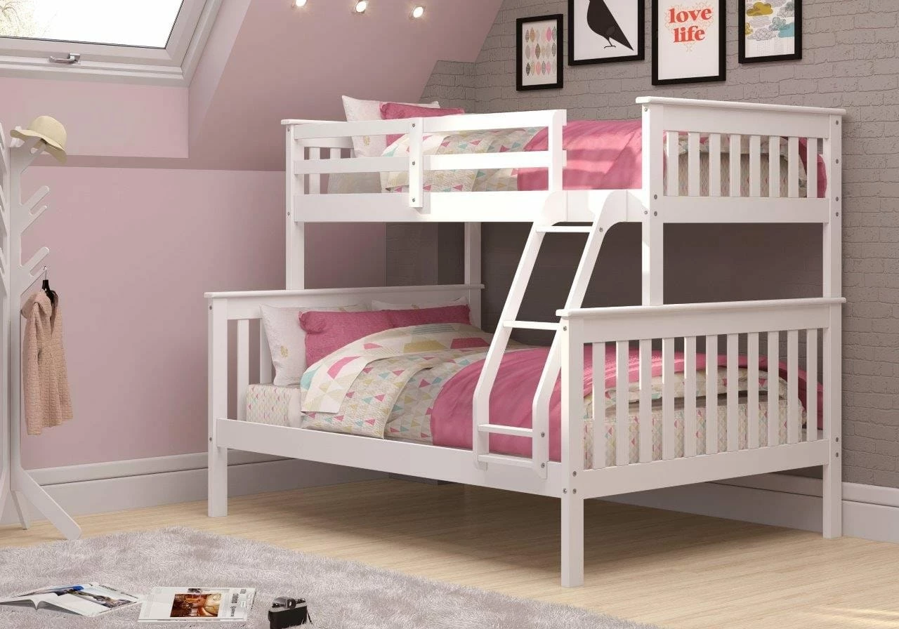 Our Twin Over Full Mission style bunkbed with White finish will add warmth to any bedroom. This bed comes with a mattress ready slat system, so no Bunkie board is required.