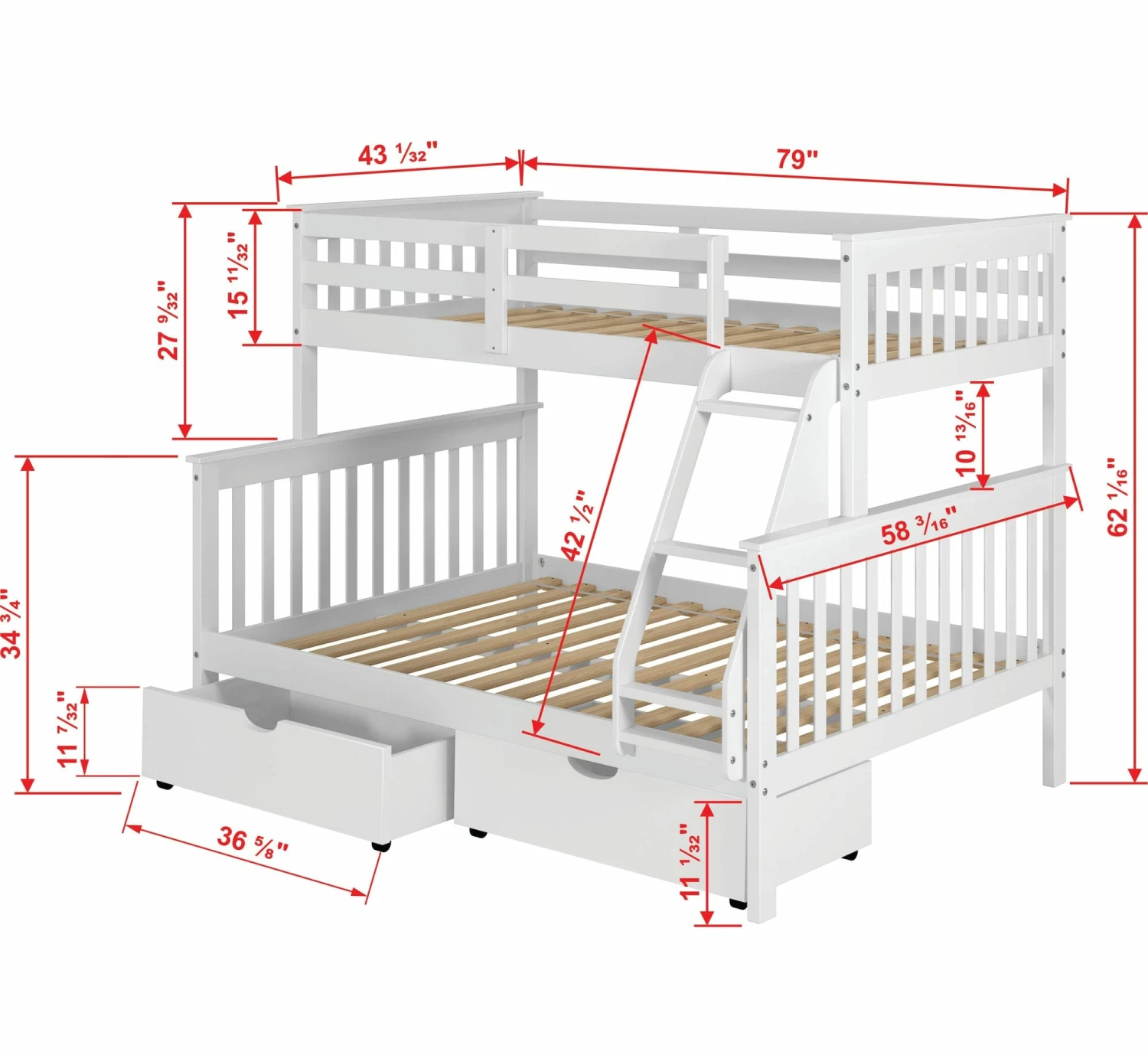 Twin/Full Mission Bunk Bed w/Dual Under Bed Drawers In White Finish by Donco