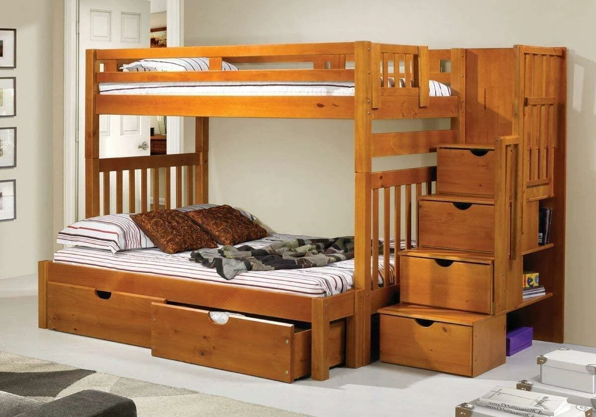 Twin/Full Tall Mission Stairway Bunk Bed With Ext Kit With Dual Underbed Drawers Honey Finish by Donco