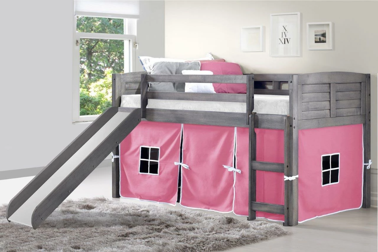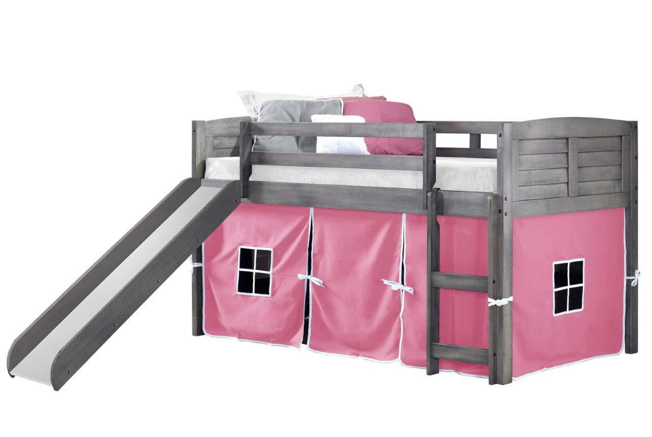 Twin Louver Low Loft w/Slide & Pink Tent Kit In Antique Grey Finish by Donco