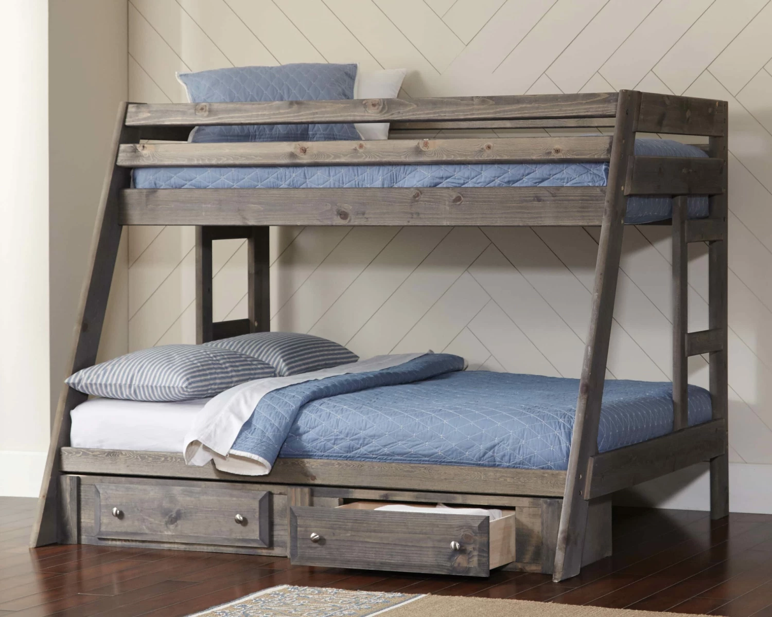 The Wrangle Hill Twin Over Full Bunk Bed is solidly constructed of durable pine with a built-in ladder and full-length guard rails for safety. Finished in a beautiful gun smoke this bunk bed is sure to delight. An optional trundle is also available.